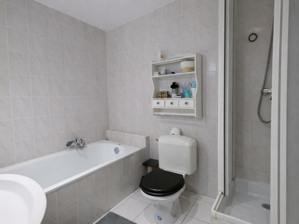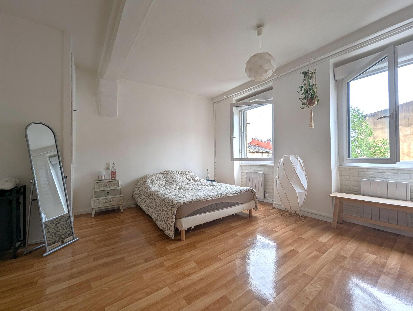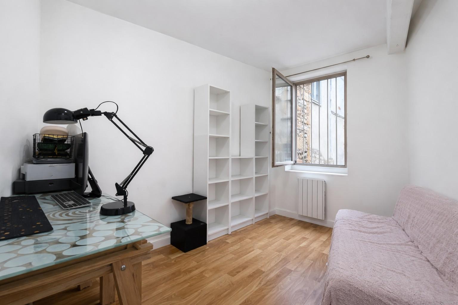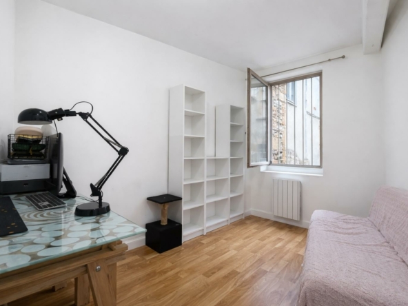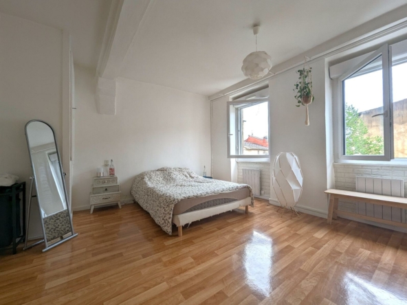 A l’étage, vous trouverez une chambre côté cour avec rangements, une seconde grande chambre lumineuse côté rue, ainsi qu’une salle de bains (douche et baignoire) et un 2ème wc.
