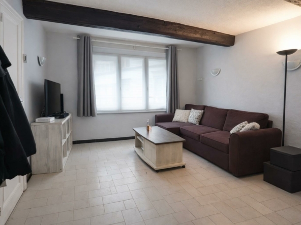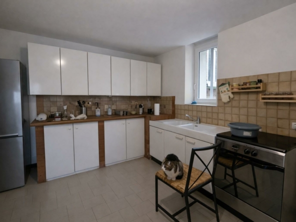Le logement dispose au rez-de-chaussée d’une pièce à vivre ouvrant sur une cuisine spacieuse, avec un accès à un wc et un débarras.