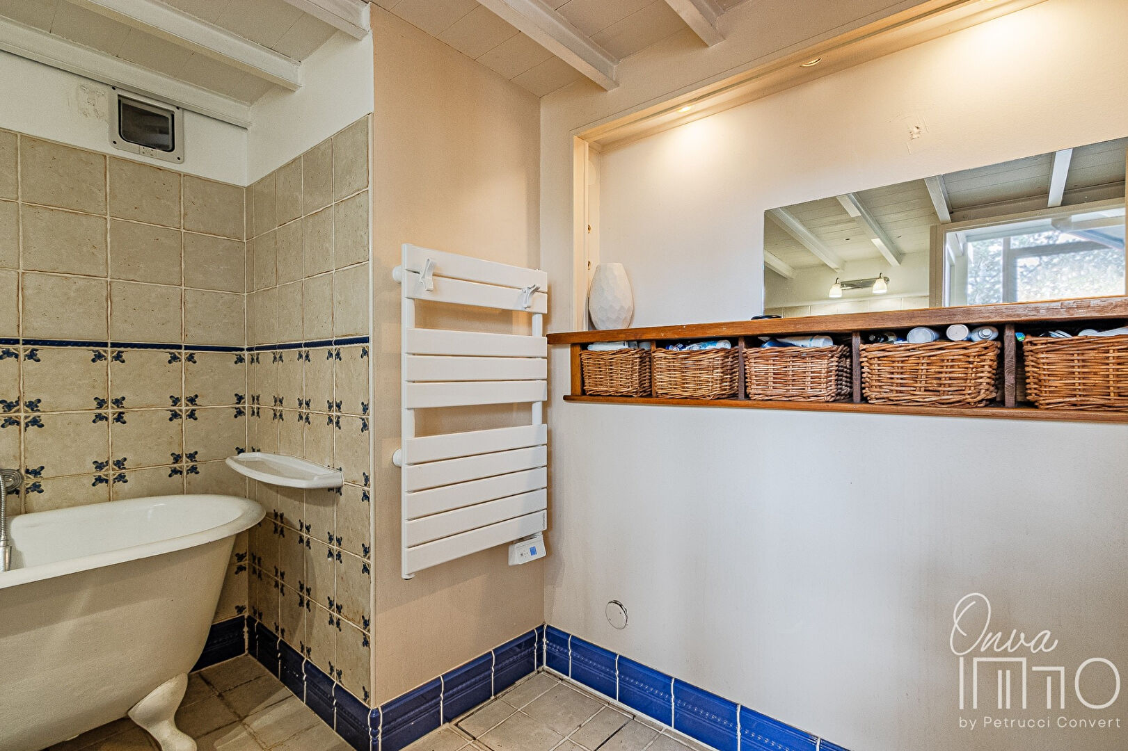– d’une salle de bain au charme d’antan avec ses carreaux et sa baignoire sur pieds et de WC séparés.