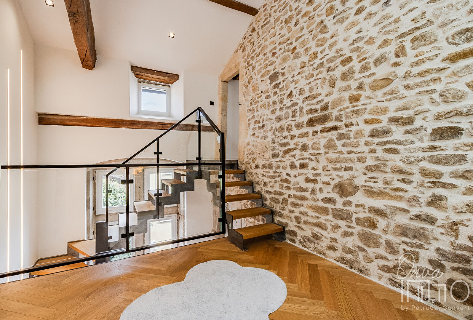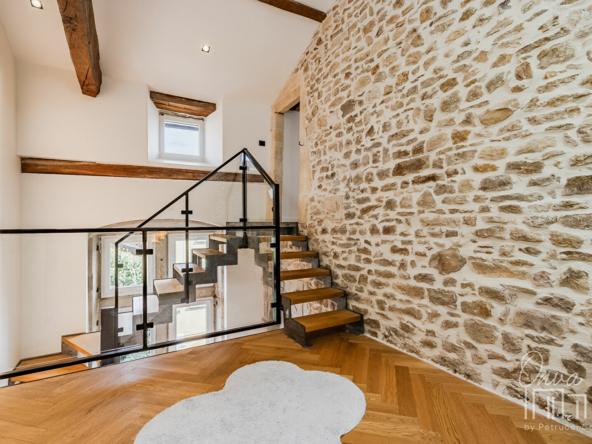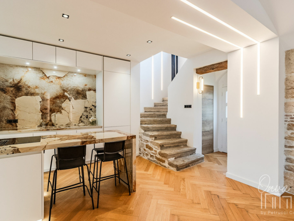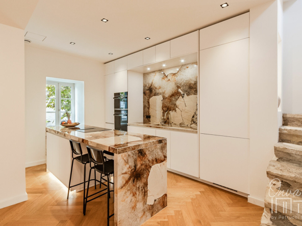 – l’élégante cuisine entièrement équipée et neuve qui s’intègre parfaitement au décor avec ses lignes épurées et son sublime îlot central créant la liaison parfaite entre l’espace de vie et la montée au coin nuit par son escalier d’époque en pierre.