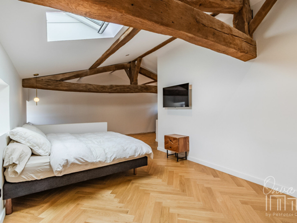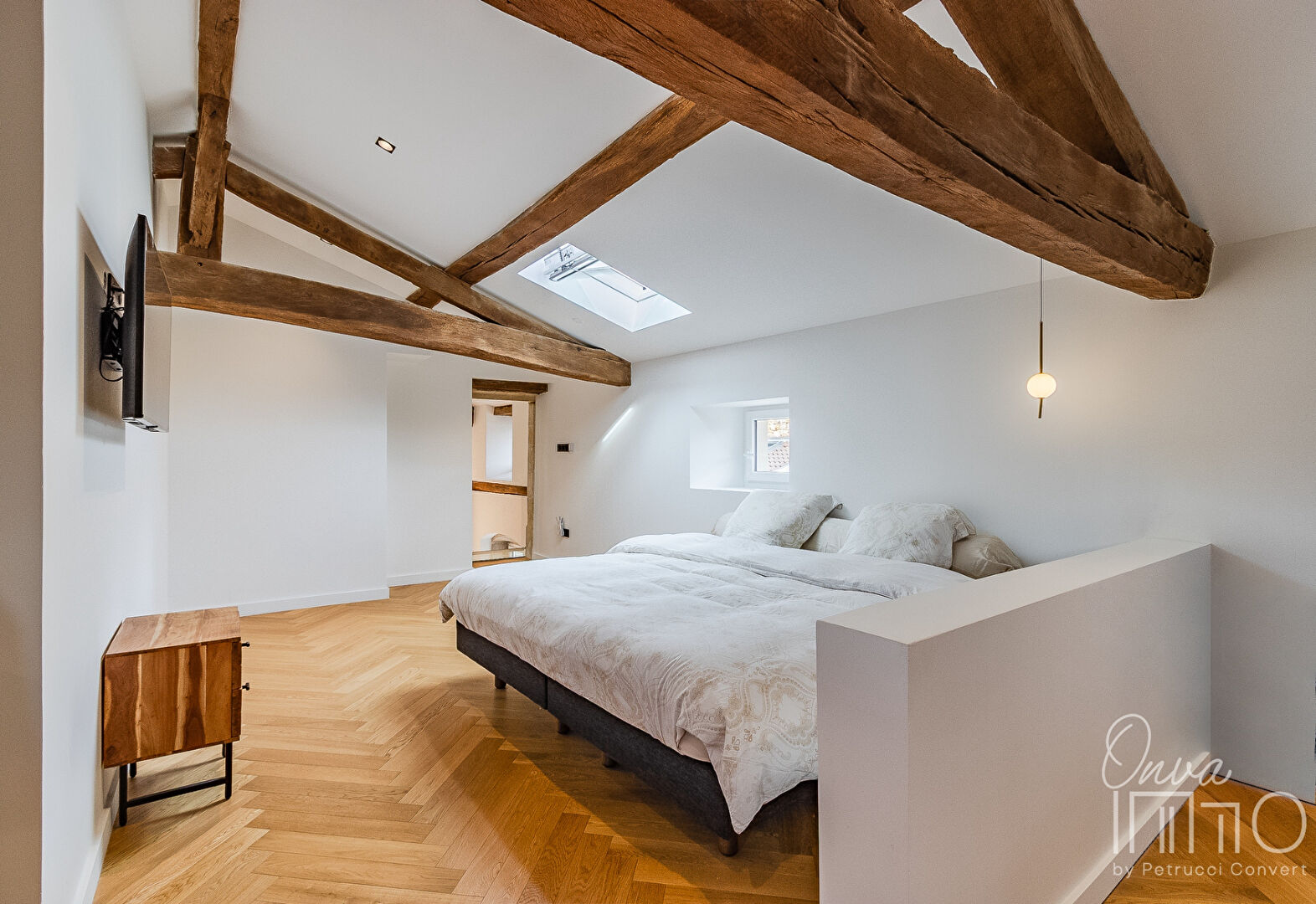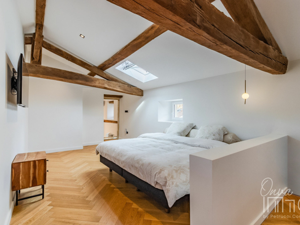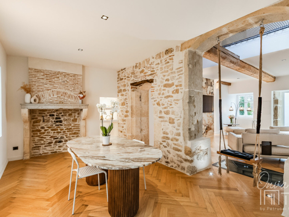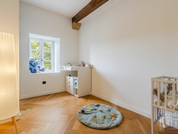 La pièce de vie est la pièce maîtresse de cette maison, celle qui crée le coup de coeur dès le passage de la porte d’entrée avec ces 78m² baignés de lumière grâce à son orientation Est/Ouest. Ici tout s’associe avec harmonie, le parquet chêne, les poutres apparentes, la cheminée, les murs en pierre et des matériaux nobles pour créer une atmosphère unique.