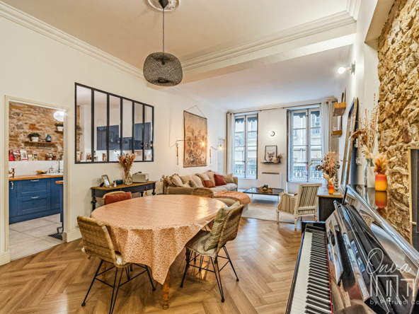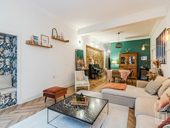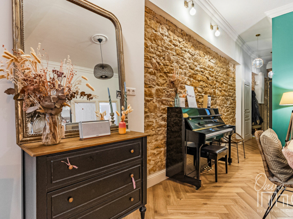 Dès l’entrée, le ton est donné et révèle immédiatement le cachet de l’ancien. Elle distribue une belle pièce de vie de 34 m², aux volumes généreux, sublimée par un parquet en bâton rompu, des moulures au plafond, une belle hauteur sous plafond et un mur en pierre apparente qui souligne le caractère du lieu, bénéficiant de belles ouvertures.