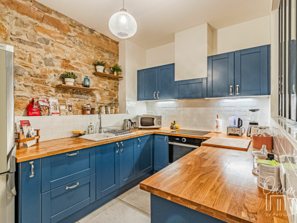 La cuisine indépendante de 8m², ouverte visuellement par une verrière, séduit par son style contemporain et ses matériaux chaleureux, et s’intègre harmonieusement à l’ensemble. Elle bénéficie également d’un mur en pierre apparente, renforçant le cachet de l’ensemble.
